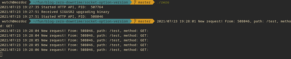 Проверим функциональность, отправив HTTP-запрос в конечную точку. Обновляем двоичные файлы с помощью сигнала Linux SIGUSR2: отправляем его с другого терминала, например с pkill -SIGUSR2 zero. Приложение «закрыто», и терминал снова готов к использованию.