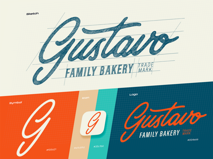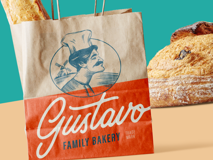 Это дизайн логотипа и фирменная концепция упаковки для небольшой пекарни Gustavo, названной в честь ее основателя. Иллюстрация с изображением силуэта пекаря сочетается со сложным оформлением в названии бренда и контрастирующим шрифтом без засечек для пояснительной части.