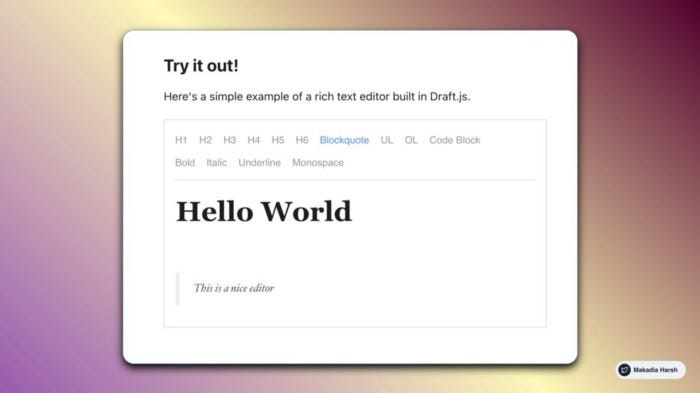 Draft.js легко впишется в любое React-приложение, ведь он абстрагирует от деталей отрисовки через API выбора и поведения ввода.