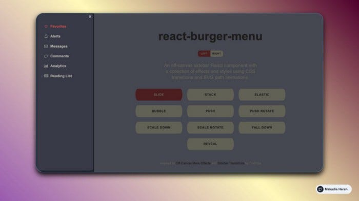 React-компонент боковой панели off-canvas с коллекцией эффектов и стилей, анимацией SVG-путей и CSS-переходами.