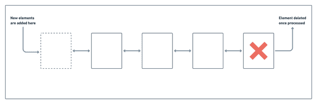 Основная концепция любой системы очередей тривиальна. Реализация CS101 берет за основу связанный список элементов. Система очередей добавляет элементы (или, в нашем случае, события) на один конец, потребляя их с другого, как показано на рисунке ниже. Как только система отработает событие, его можно удалить из списка.