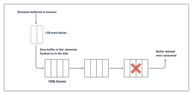 Со стороны потребителя нам под силу обрабатывать партии гораздо большего объема, чтобы избежать накладных расходов на выполнение небольших операций ввода-вывода. Для этого на диске создаются сегменты из ста тысяч событий, которые система обрабатывает вместе. Как только система обработает сегмент пакетов, его, как правило, можно удалить (см. диаграмму ниже):