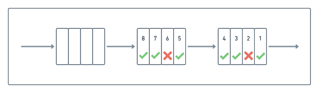 Например, если не удалось доставить событие, мы помечаем его как неудачное и блокируем дальнейшие события от пользователя. Тем временем начинают обрабатываться другие несвязанные события, присутствующие в очереди после этого неудачного события. Такой процесс может привести к сценарию (показанному на следующей диаграмме), в котором некоторые события уже были обработаны (отмечены зеленой галочкой), в то время как другие (отмечены красным крестом) по-прежнему ожидают обработки: