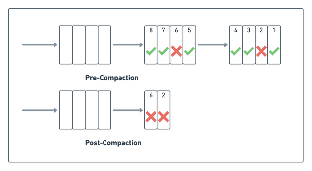В процессе уплотнения система удаляет уже обработанные события, сохраняя при этом необработанные. Как видно на диаграмме ниже, процесс объединил два ведущих частично обработанных блока в один: