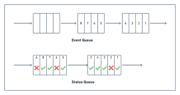 Решение — не обновлять статус события мгновенно, “на месте”, а сохранять его в отдельной очереди. По мере того как система обрабатывает события, она добавляет статус успеха/сбоя и другие метаданные события (например, идентификатор события, причину сбоя и т. д.) в отдельную очередь.