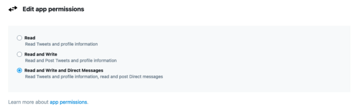 После этого обязательно копируем API-ключи: публичный и приватный. Вернувшись на экран обзора, выбираем новое приложение и нажимаем на Edit в левом верхнем углу. Устанавливаем полный перечень разрешений Read and Write and Direct Messages (чтение, запись, личные сообщения), чтобы впоследствии получить доступ ко всей необходимой информации и обновить заголовок.