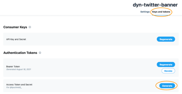 На завершающем этапе создаем токены аутентификации Access Token и Secret, выбирая приложение и переключаясь на вкладку Keys and token сразу под заголовком.