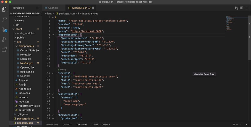 В файле package.json приводятся необходимые для проекта пакеты (и их версии). Самые распространенные зависимости: React Router DOM, библиотека тестов, пользовательский интерфейс (материальный или семантический), скрипт запуска (проверка порта для запуска на нем локального хоста).