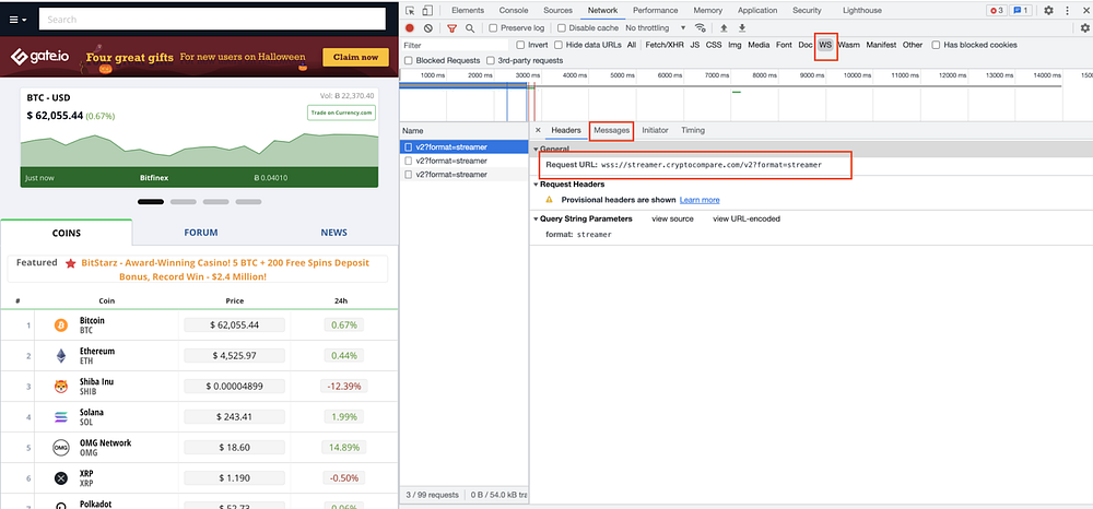 inspect. - Перейдите во вкладку WS — вам откроется изображение, похожее на скриншот выше (вы увидите, что url запроса для этого веб-сокета