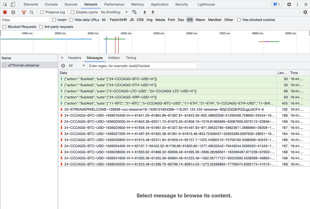 wss://streamer.cryptocompare.com/v2?format=streamer). - Перейдите во вкладку Message, чтобы получить сообщение, которое необходимо отправить на сервер для завершения верификации.