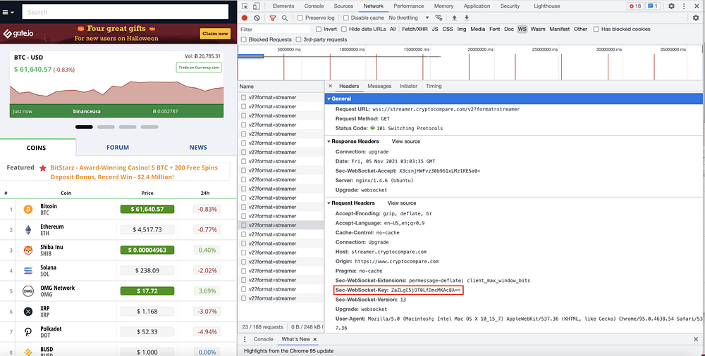 Выше представлен фрагмент кода для примера. Обратите внимание на то, что необходимо изменить ключ WebSocket (Sec-WebSocket-Key) на тот, который вы получите из браузера во вкладке Headers. Пример ниже: