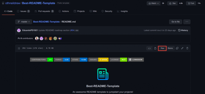 Перейдите в репозиторий Best-Readme-Template и кликните файл README.md. Затем нажмите на кнопку Raw.