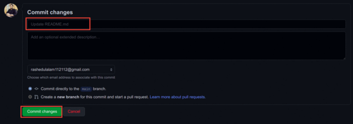 После внесения изменений в файл readme прокрутите страницу вниз до раздела Commit changes, напишите сообщение о фиксировании изменений и нажмите на кнопку Commit changes (Зафиксировать изменения).