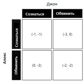 - Если Алекс обвинит Джона, то Джону тоже целесообразно обвинить Алекса, потому что срок в два года меньше, чем в три. Таким образом, Джону тоже стоит обвинить Алекса. Параллельные рассуждения говорят о том, что Алексу тоже целесообразно обвинить Джона.