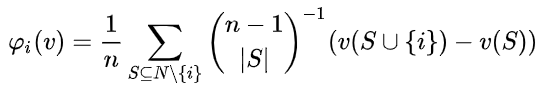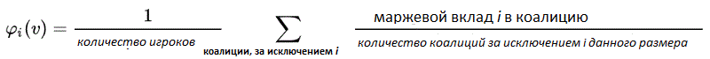 - N — суммарное число участников, и сумма распространяется на все подмножества S из N, за исключением игрока i