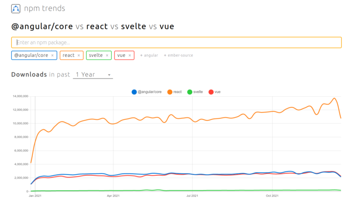 В современной разработке веб-приложений лидируют фреймворки на основе JavaScript/TypeScript, и эта тенденция сохранится в 2022 году. Существует множество веб-фреймворков на JavaScript/TypeScript, но два фреймворка выделяются среди остальных — React от Facebook и Angular (Angular 2+) от Google.