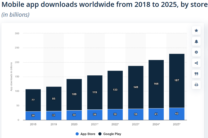 В 2022 году число пользователей мобильных телефонов продолжит расти, как и число загрузок приложений. Ожидается, что в 2022 году будет загружен 171 миллиард приложений. Создание мобильных приложений — это огромный рынок в современной разработке ПО.