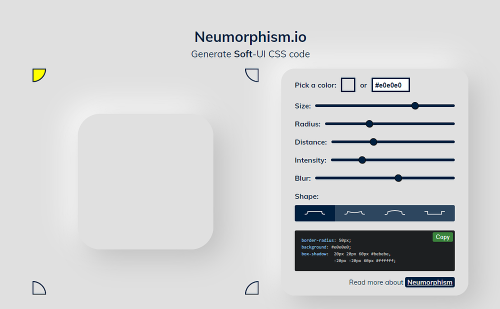 CSS код, генерируемый с помощью Neumorphism, создает так называемый мягкий (плавный) графический интерфейс. Стиль Neumorphism позволяет выбрать цвет, изменить размер, радиус, расстояние и многое другое. Попробуйте — вам точно понравится.