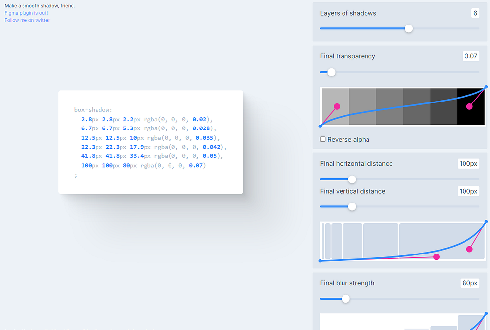 Этот потрясающий инструмент позволяет легко создавать плавные тени с помощью CSS. Вам нужно всего лишь задать параметры тени — и код будет сгенерирован автоматически.