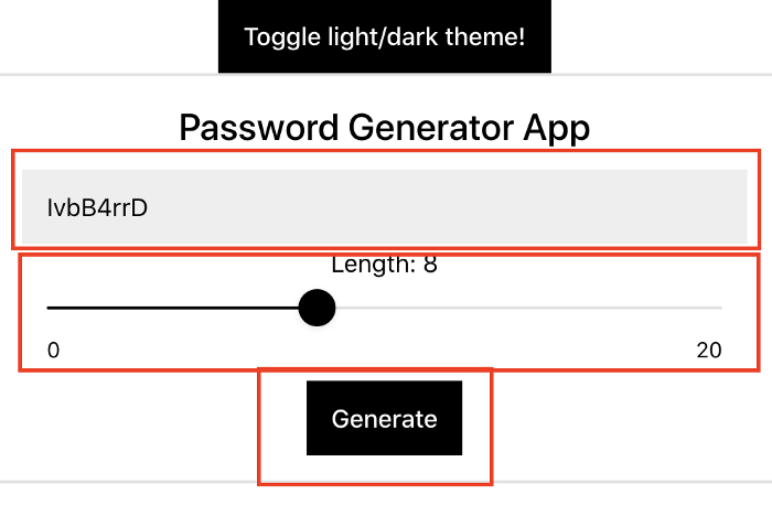 Приведенный выше код добавит компонент Button к Card, куда был добавлен PasswordGenerator. Нажатием на эту кнопку мы можем переключать значение переменной theme (которое приходит из вызова useState).