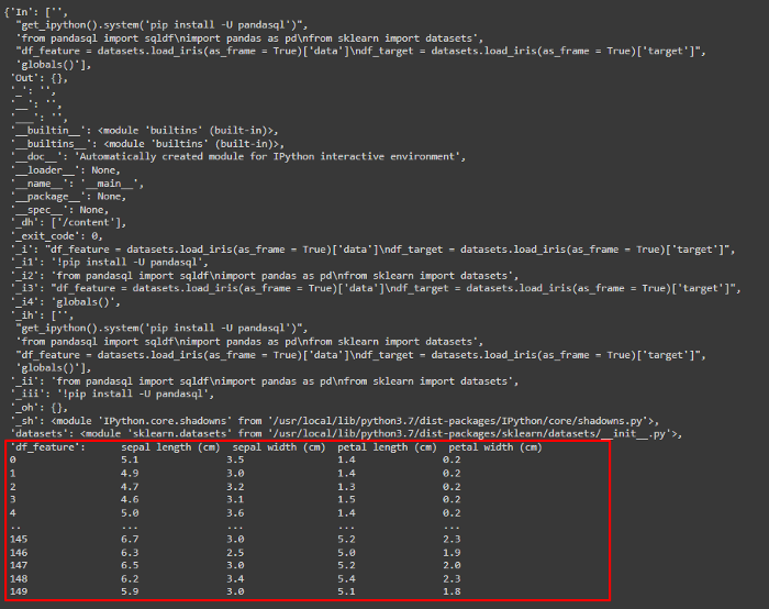 >> dict_keys(['__name__', '__doc__', '__package__', '__loader__', '__spec__', '__builtin__', '__builtins__', '_ih', '_oh', '_dh', '_sh', 'In', 'Out', 'get_ipython', 'exit', 'quit', '_', '__', '___', '_i', '_ii', '_iii', '_i1', '_exit_code', '_i2', 'sqldf', 'pd', 'datasets', '_i3', 'df_feature', 'df_target', '_i4', '_4', '_i5', '_5', '_i6'])