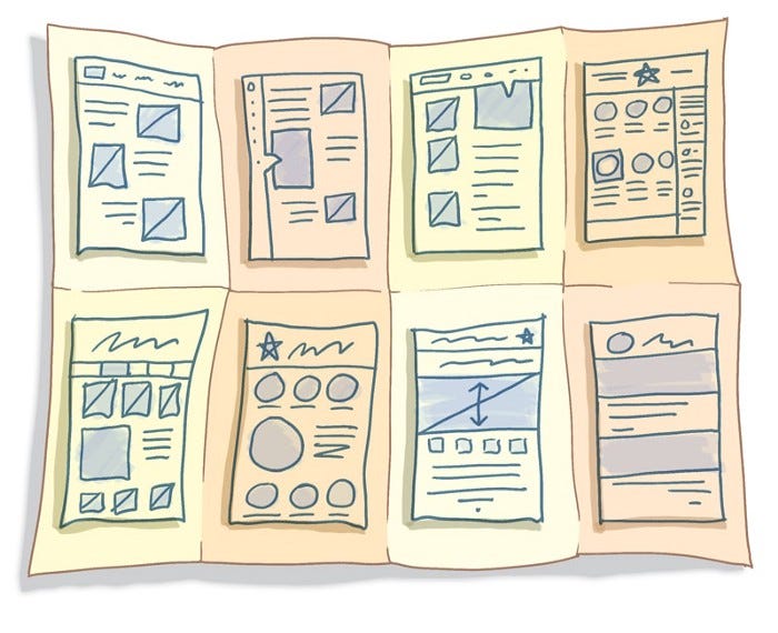 Отличный способ сделать это — попробовать упражнение «сумасшедшие восьмерки». Возьмите лист бумаги, сложите его пополам, затем сложите еще раз пополам. Теперь у вас есть восемь панелей, чтобы набросать восемь различных способов решения проблемы проектирования.