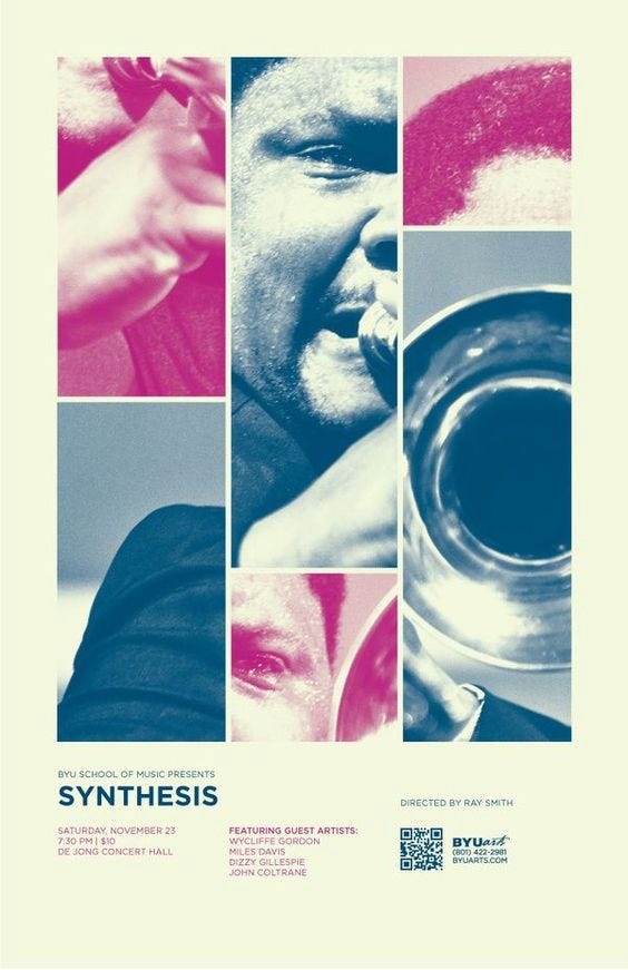 В данном плакате масштаб используется еще одним способом. Основным элементом выступает коллаж из вырезанных джазовых инструментов и музыкантов. Здесь нет наиболее важного изображения, но, когда они сочетаются с пространством и цветом, они создают одну большую фотографию. Мы сразу же понимаем, что это реклама мероприятия джазовой музыки. Если мы хотим узнать больше, мы смотрим в конец страницы, чтобы узнать о дате, местоположении и информации об исполнителе.