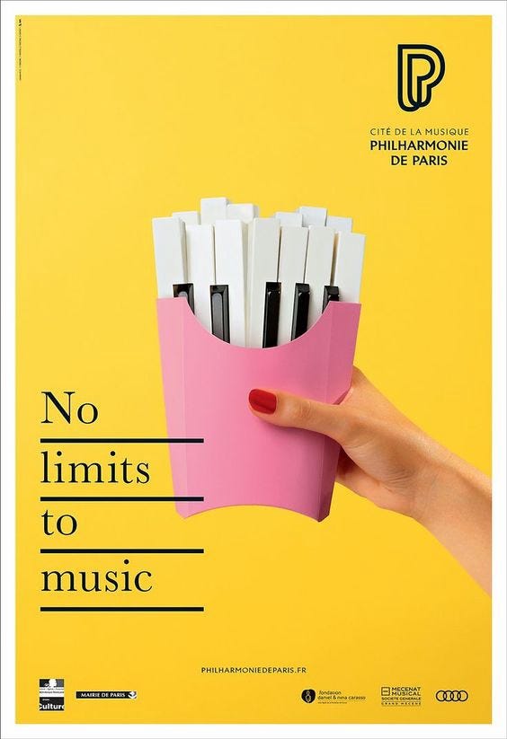 В данном примере дизайн использует определенную цветовую палитру, которая состоит в основном из желтого, черного, белого и розового. Желтый и розовый — два смелых цвета, но их использование помогает привлечь внимание и создать иерархию. Желтый создает яркий фон, но розовый цвет в упаковке с клавишами пианино фокусирует на себе внимание. Однако посмотрите, как используются и другие принципы дизайна, такие как масштаб и правильное использование негативного пространства.