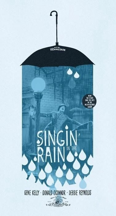 На данном примере дизайна плаката используется однотонная цветовая палитра, которая помогает создать иерархию и единство. В зонтике используется темно-синий цвет. Название фильма и капли дождя перевернуты из основного двухтонового изображения персонажа, поющего под дождем. Хорошее использование негативного пространства вокруг зонтика и изображения помогает еще больше привлечь ваше внимание.