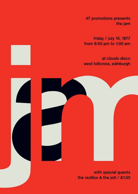 Данный постер умело использует негативное пространство для создания заголовка. Обратите внимание, как буква «а» в заголовке «jam» отображается внутри букв j и m. Черный создает темный контраст в сочетании с другими цветами. С использованием цвета, масштаба и белого пространства, данный дизайн привлекает к себе внимание.