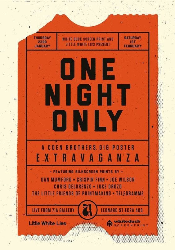 Обратите внимание на данный плакат. Его дизайн прост: он использует ограниченную цветовую палитру, типографику и линии. Дизайн в основном состоит из шрифтов, однако в нем имеется уровень иерархии. Сначала вы замечаете заголовок «One night only», так как он имеет большой размер, заглавные буквы и жирный шрифт.