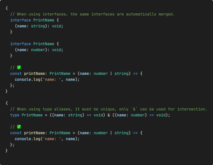 И интерфейс, и тип могут объявлять типы объектов или типы функций. Однако интерфейс может объявлять один и тот же интерфейс несколько раз, и они будут объединены автоматически, в то время как псевдонимы типов не объединяются и должны быть уникальными.