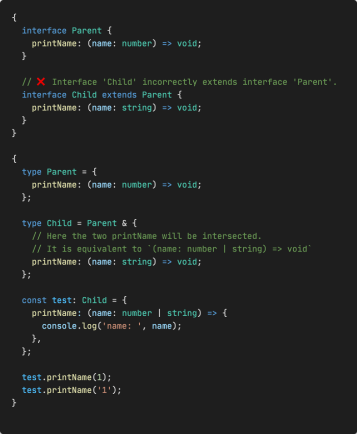 Другим ключевым моментом является то, что псевдонимы типов используют пересечение, а интерфейсы — наследование.