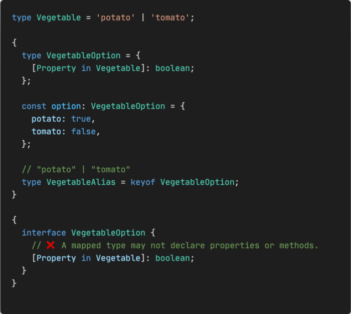 type Vegetable = ‘potato’ | ‘tomato’;