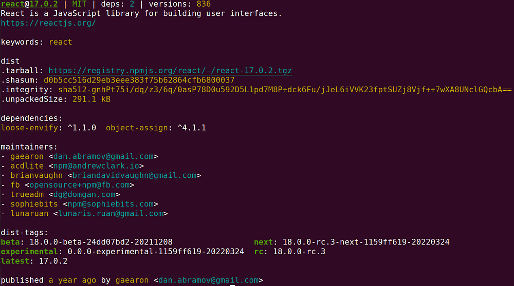 Хотите узнать все о пакете? Тогда воспользуйтесь командой npm info, которая быстро просмотрит по нему всю информацию и сообщит о: