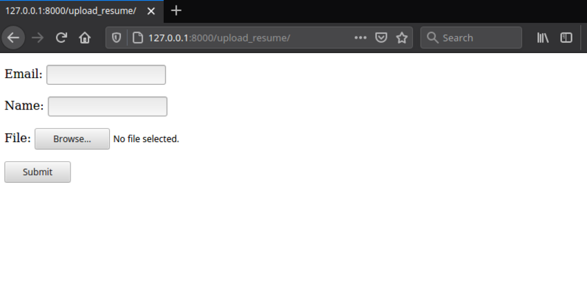 Теперь, если вы запустите сервер и перейдете по адресу http://127.0.0.1:8000/upload_resume/, вы увидите формы, как изображено ниже: