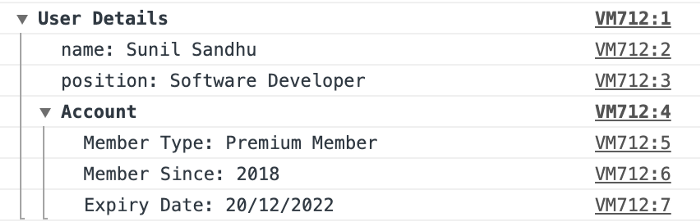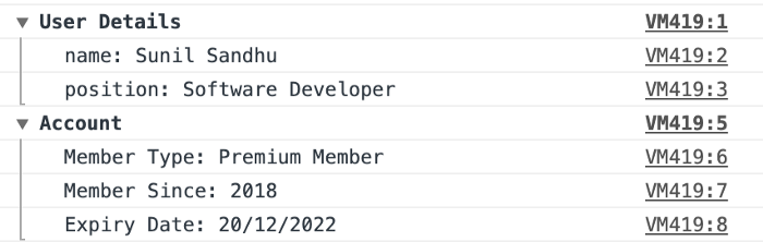 console.groupEnd();// обратите внимание на то, что в конце записи два вызова groupEnd(), поскольку ‘Account’ вкладывается внутрь ‘User Details’