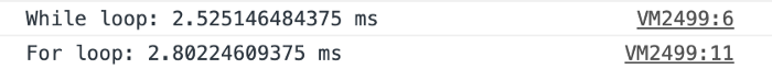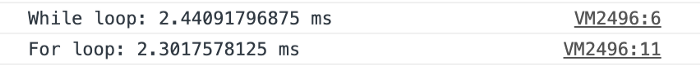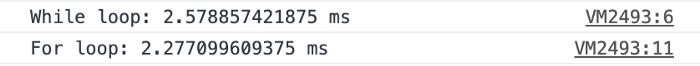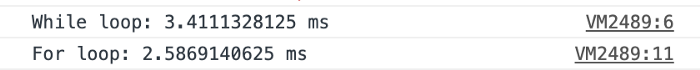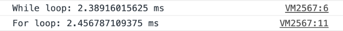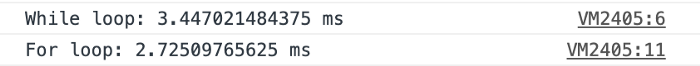 console.timeEnd("While loop");console.time("For loop");