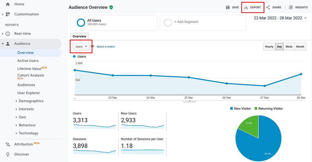 Если у вас не так много данных или вам кажется, что все вышеперечисленные процедуры слишком хлопотны, то можно экспортировать некоторые таблицы и представления из веб-консоли GA. Не забудьте захватить две самые важные метрики, прежде чем покинуть GA — информацию о просмотрах страниц и сессиях пользователей.
