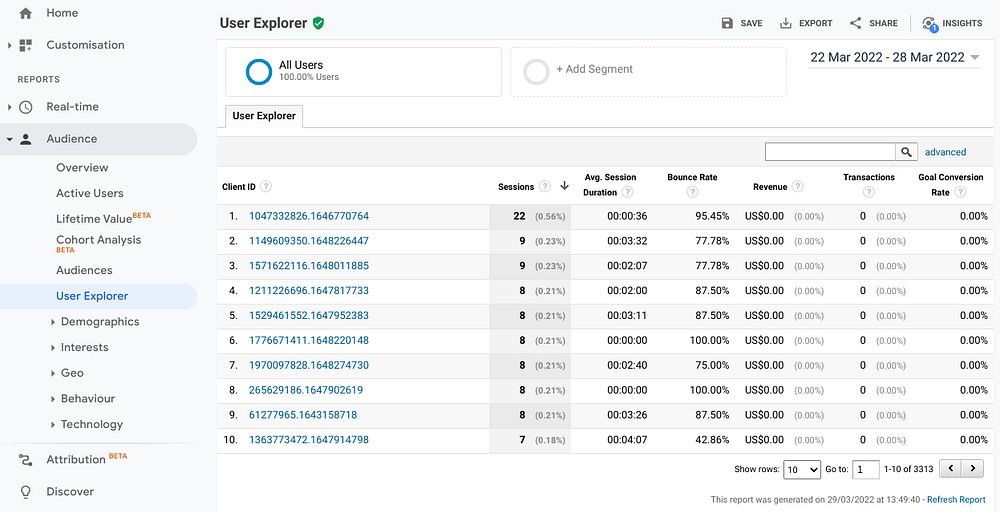Чтобы экспортировать отдельные сессии, перейдите в Audience — User Explorer и нажмите export:
