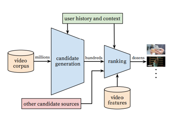 До 2015 года YouTube использовал матричную факторизацию для обучения своей модели, используя только историю просмотров пользователей. Этот подход переосмыслили, и теперь ориентация идет на обобщенный входящий поток, то есть непрерывные и категориальные признаки.