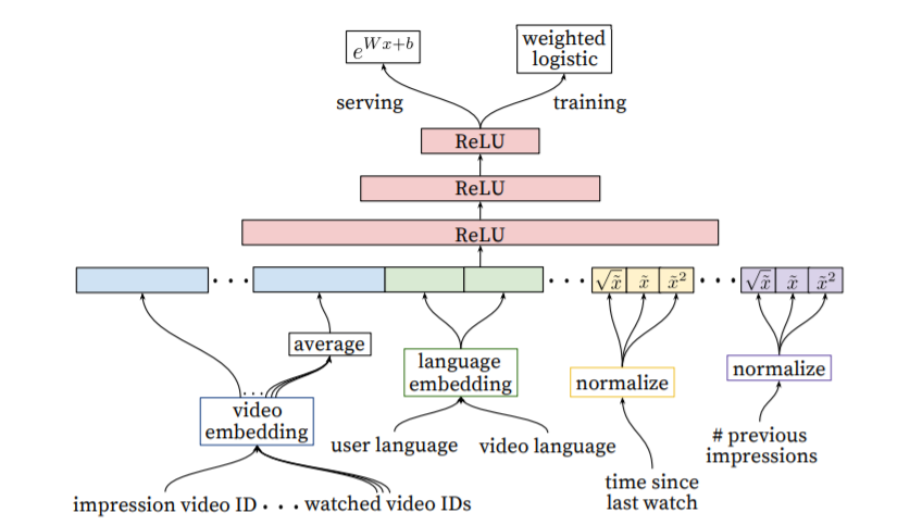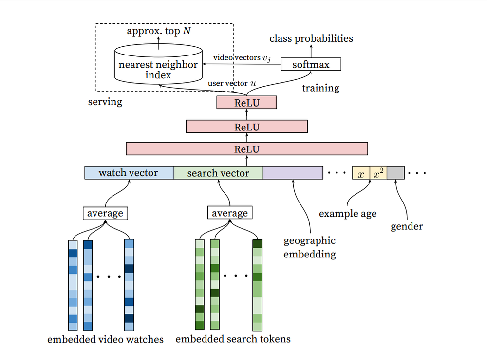 Демографические характеристики пользователя — пол, возраст, состояние входа в систему — являются примерами непрерывных признаков. Встроенная история поиска и просмотров являются категориальными признаками. Эти входные данные передаются в четыре плотно связанных друг с другом слоя ReLU. В процессе обучения входные данные поступают в слой softmax, который классифицирует видео по различным категориям.