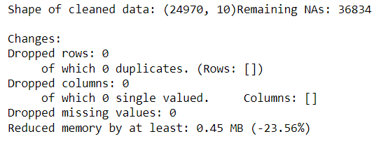 Приведенная выше функция выдает информацию об очистке данных, выполненной для нашего пробного датасета. Процедура Klib data_cleaningвыполняет следующие шаги: