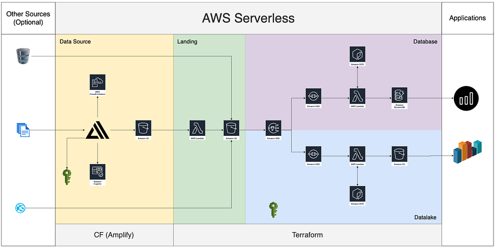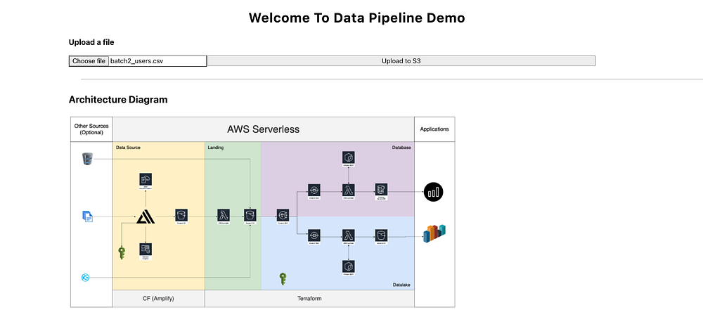 Amplify — это сервис, который помогает легко создавать фулстек приложения. В целях демонстрации мы будем использовать его для репликации источника данных. Мы создадим интерфейс, и пользователь сможет поместить туда файл, который будет принят нашим конвейером данных.