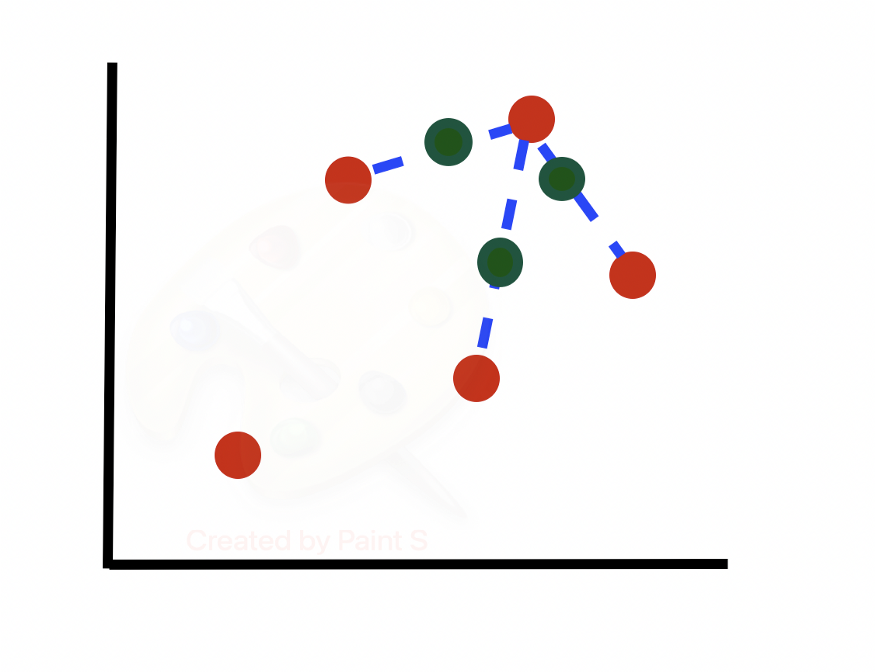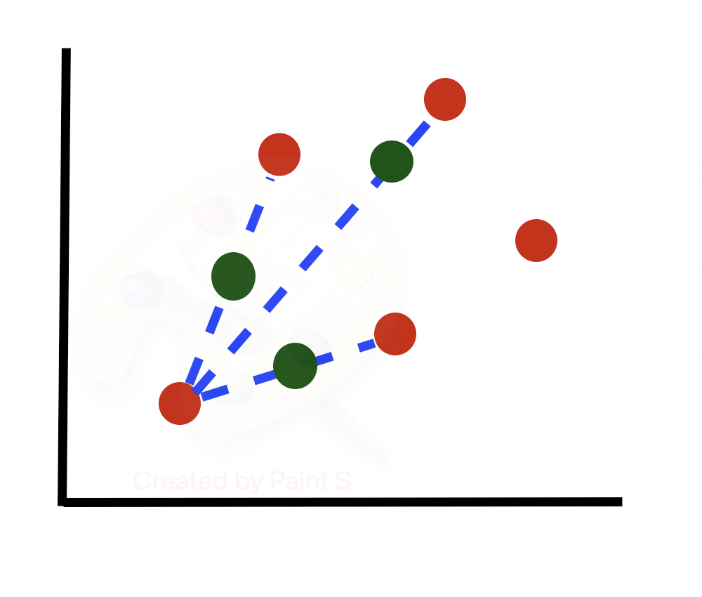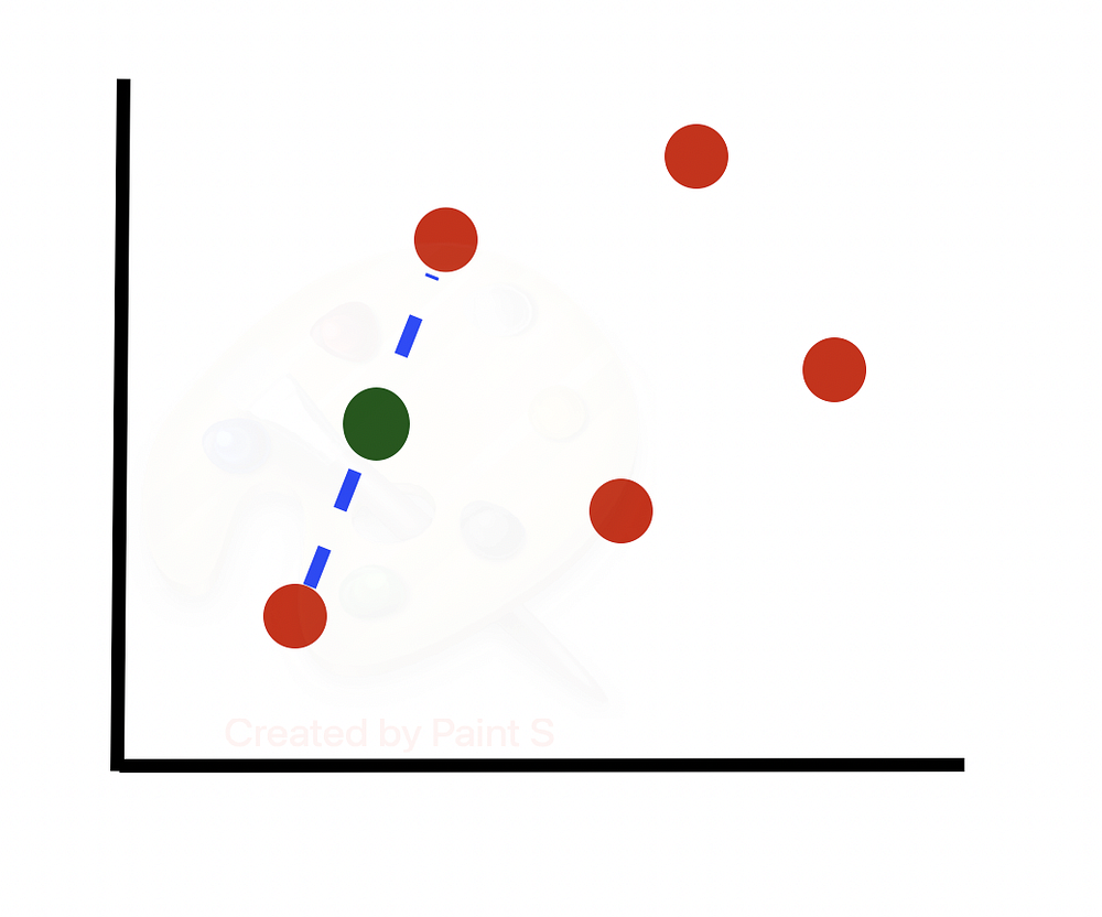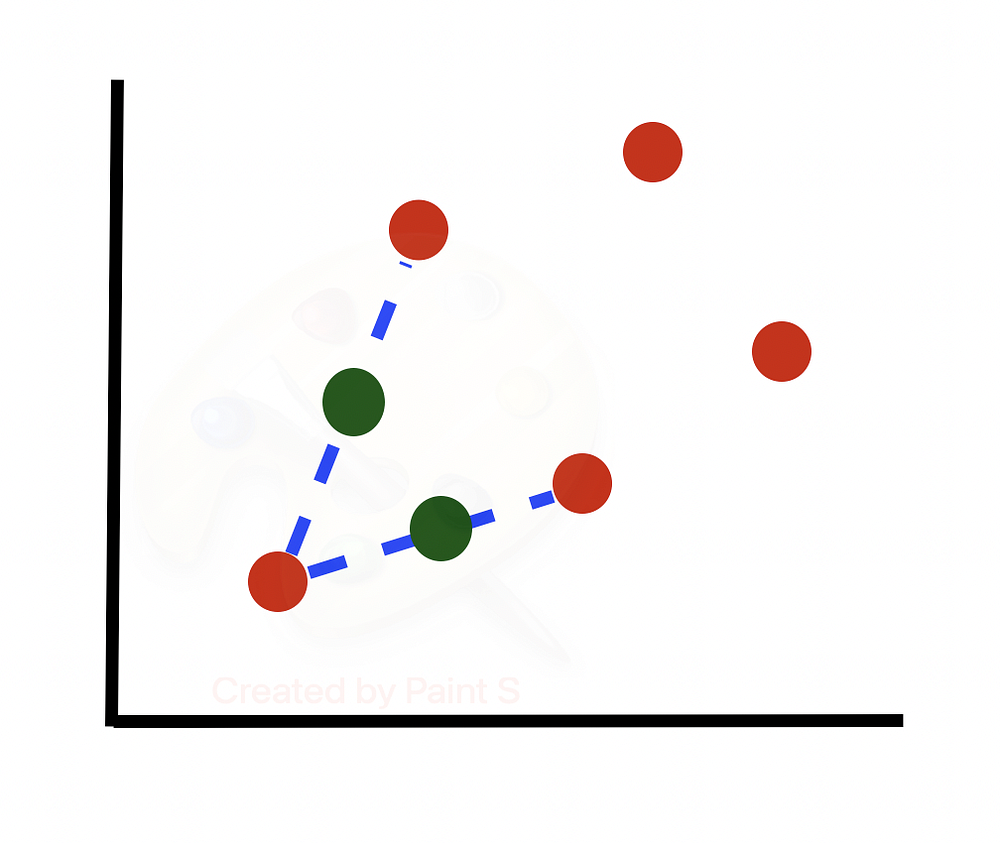 Рассмотрим алгоритм более подробно. Предположим, у нас есть несбалансированный набор данных (строк одного класса гораздо больше, чем другого). Построим граф подмножества строк миноритарного класса. Будем учитывать только 2 из множества признаков, предполагая, что последующие шаги будут выполняться для всех N измерений в наборе данных.