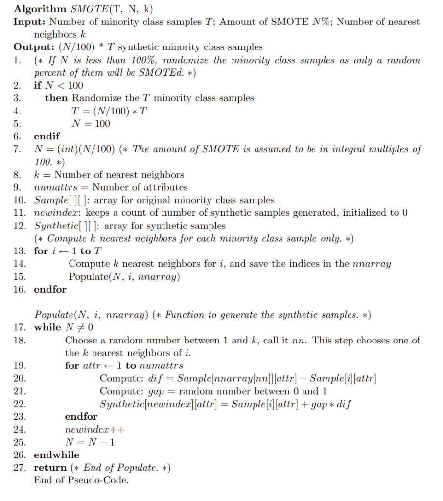 Алгоритм SMOTE был описан Нитешем Чавла и др. в техническом документе 2002 года под названием SMOTE: Synthetic Minority Over-sampling Technique. В этом документе приводится следующий псевдокод: