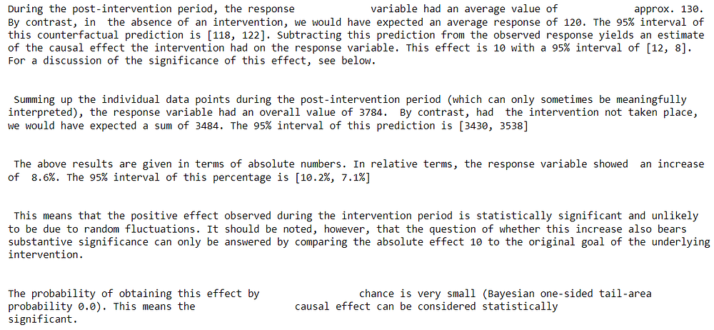 Чтобы узнать больше о причинно-следственном анализе интервенции на основе временных рядов, ознакомьтесь с документацией Causalimpact.