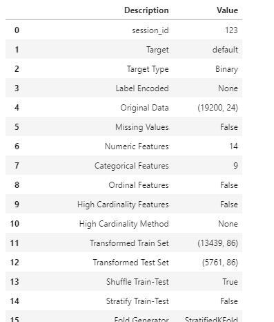 Далее нам необходимо инициализировать среду и конвейер преобразования. Это можно сделать с помощью функции setup(). Эта функция выполняет все шаги по предварительной обработке данных, чтобы подготовить их к работе. Мы также можем вручную переопределить параметры по умолчанию, указав их при вызове. Нам просто нужно передать набор данных и целевой столбец, а все остальные параметры являются необязательными.