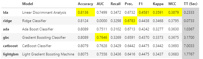 # Сравниваем различные модели в зависимости от их метрик производительности. По умолчанию модели сортируются по точности