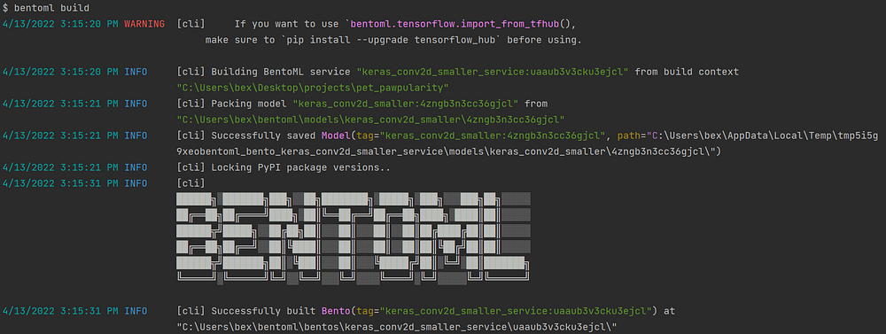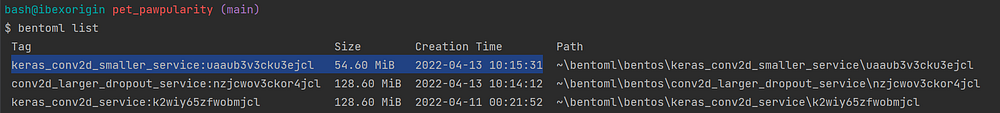 Завершив обучение и сохранение, выполните следующую команду, чтобы получить список моделей, находящихся в хранилище BentoML: